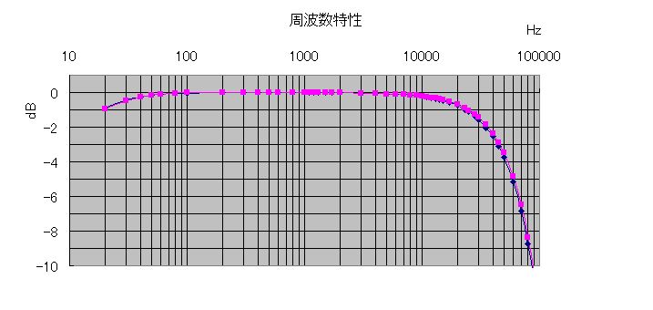 グラフ上から、AUX入力の周波数特性、2段目RIAA特性、3段目出力部のRIAA特性、1段目と2段目の合わさった物になります。レコード入力の特性です。 |